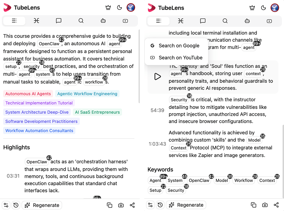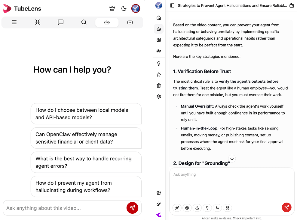 اقرأ فيديو مدته ساعة في دقيقتين، احصل على رؤى فورية من آلاف التعليقات، الذكاء الاصطناعي يوصي بأفضل الفيديوهات، اطرح أسئلة مباشرة على الفيديوهات، بدّل الترجمات ثنائية اللغة في أي وقت — إضافة واحدة تجعل يوتيوب يعمل حقًا من أجلك.