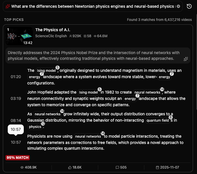 Sin buscar uno por uno. TubeLens selecciona el video más relevante entre miles y te lleva directo al momento clave.