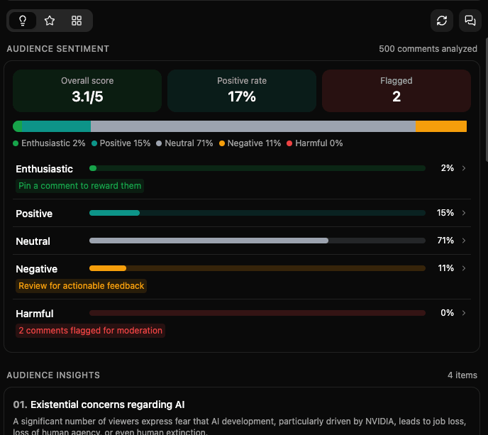 TubeLens analiza miles de comentarios y extrae sentimiento real, preocupaciones principales y joyas ocultas en segundos.