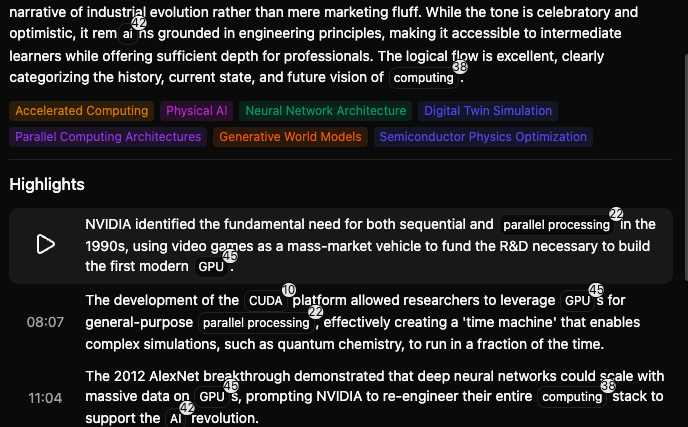 “The chapter breakdown and key points extraction mean I never miss important details. Plus the transcript search lets me find exactly what I need in seconds.”